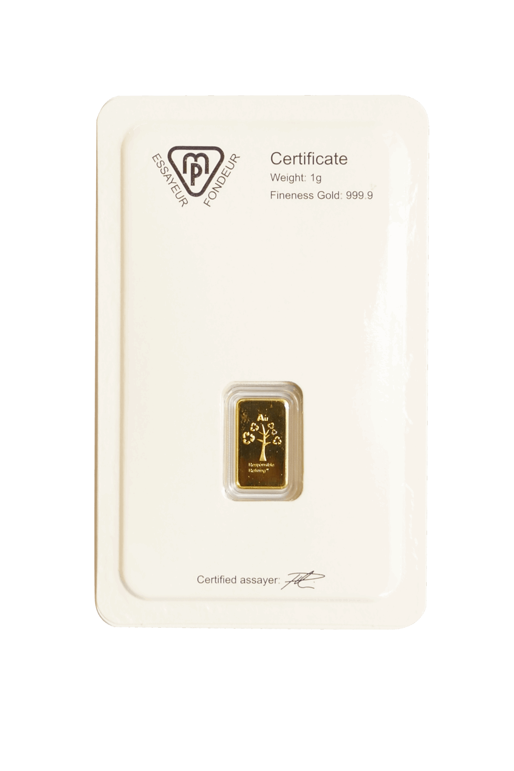 This certificate guarantees the bar’s weight (1 gram) and fineness (999.9). It also includes the bar’s unique serial number, date of manufacturing, and assayer signature.